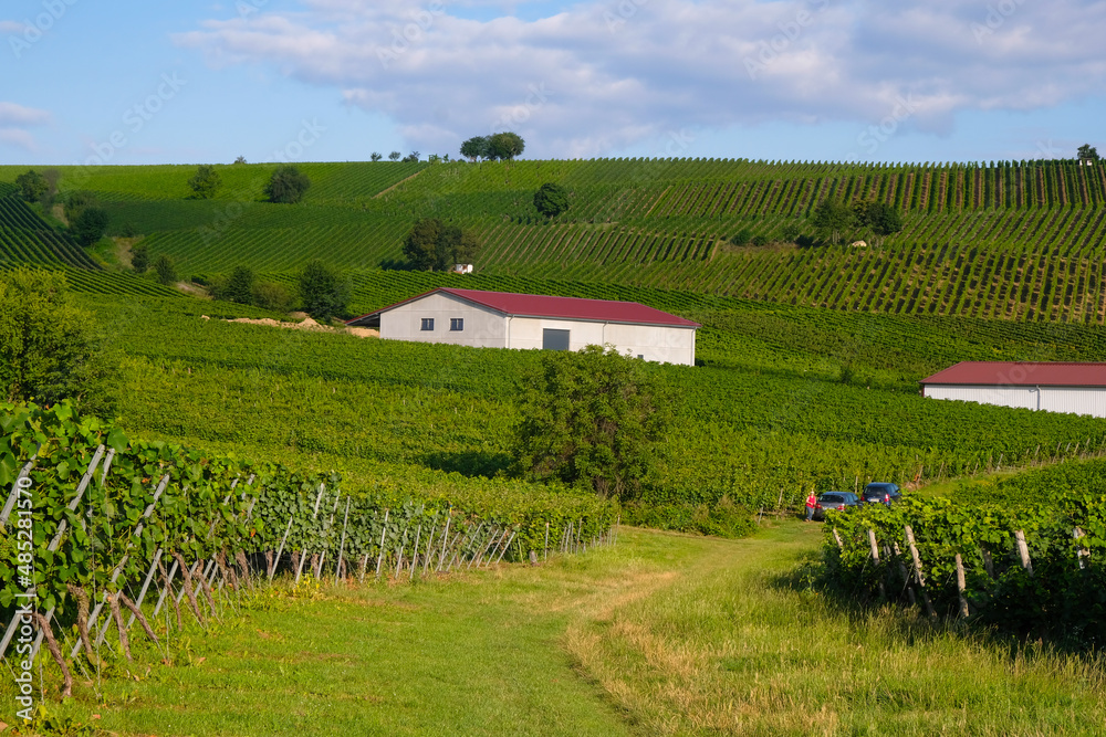 Bodenheim, Rhineland Palatinate, Germany. July 29, 2021. Vineyards on a sunny summer morning. Farmers near vineyards. Farm white buildings.