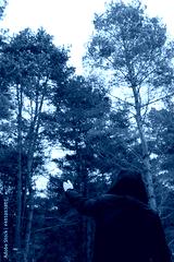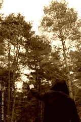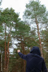 Man in a hood on a forest background. Raised hand. A man demonstrates beautiful pine trees. Ecology concept. Vertical image.