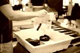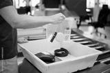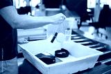 Airport security check before flight. Passenger holding plastic bag with liquids above container with laptop and personal items.