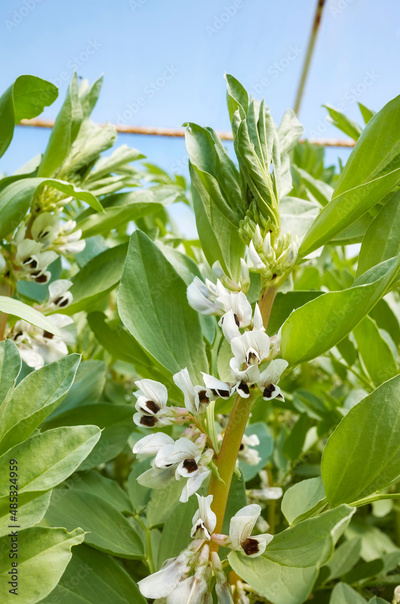 Close up picture of flowering broad bean (Vicia faba) in a greenhouse, selective focus.
