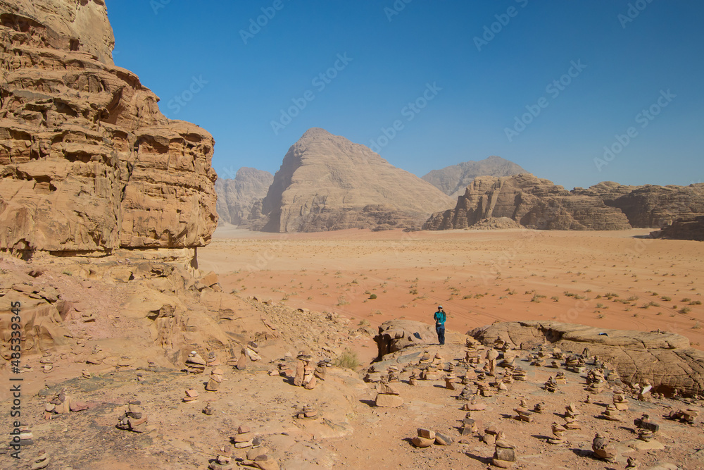 Beautiful shot of a Caucasian person standing near some huge cliffs in Wadi Rum, Jordan.