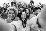 Multiracial friends taking big group selfie shot smiling at camera - Laughing young people standing outdoor and having fun - Cheerful students portrait outside school - Human resources concept