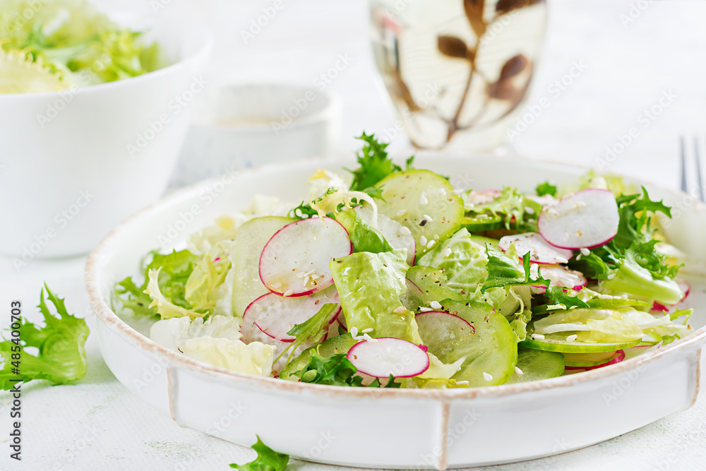 Healthy vegetarian vegetable salad of radish, cucumbers, lettuce. Vegan salad.