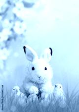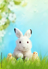 Easter bunny rabbit with painted eggs and chicks in grass on blue background. Easter holiday concept.