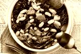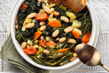 Tuscan bread soup made with toasted bread and vegetables. Ribollita. Cannellini beans, lacinato kale, cabbage verza, carrot, celery, potatoes, and onion. Itralian food. Close-up. Directly above.