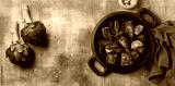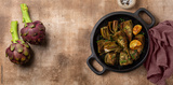 Artichoke or carciofi vegetable, raw and cooked. Artichokes boiled and roasted in olive oil with garlic, garnished with parsley and lemon. Brown table. Top view. Copy space. Banner size.