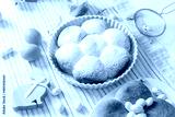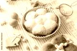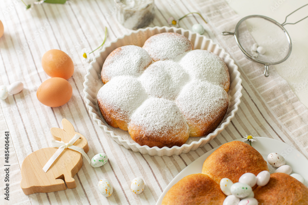 Cooking homemade pastry - buchtel buns, sweet rolls with jam filling. Easter bunny, eggs, candies and spring flowers on the table. Icing sugar. Festive preparation. Horizontal image.