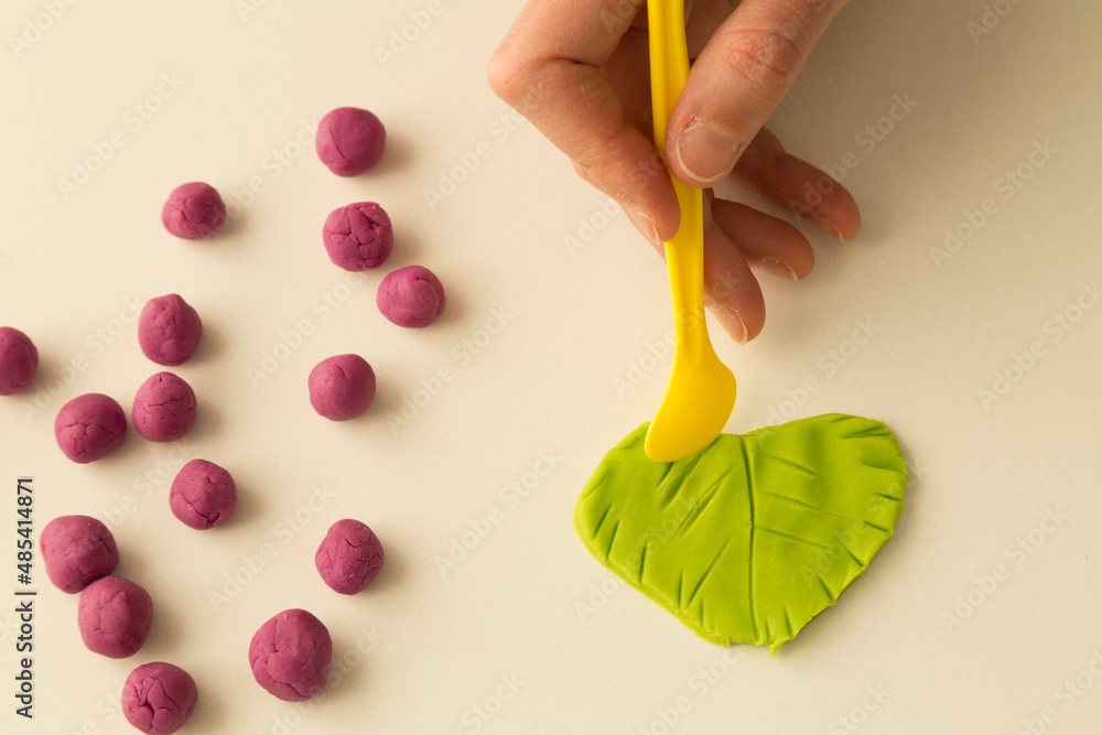 Making grape game step by step with dough for children's activity in the school art lesson and plasticine concept.