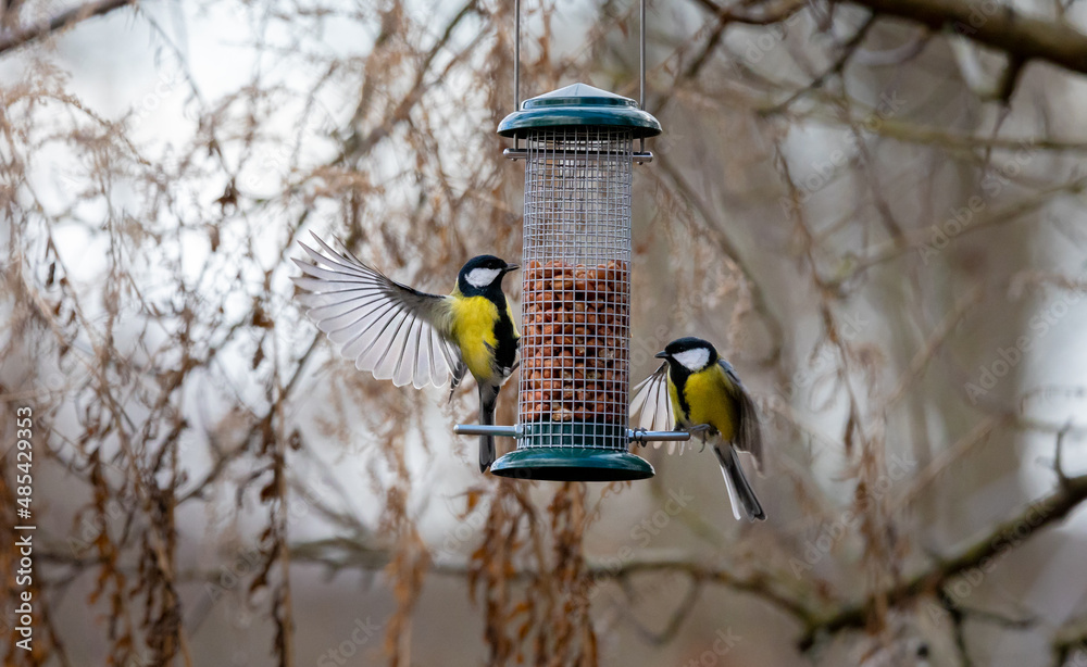 Two birds flying on feeding place, wings wide open, (great tit, Kohlmeise, Parus major), backlight, blurred background, autumn colours,