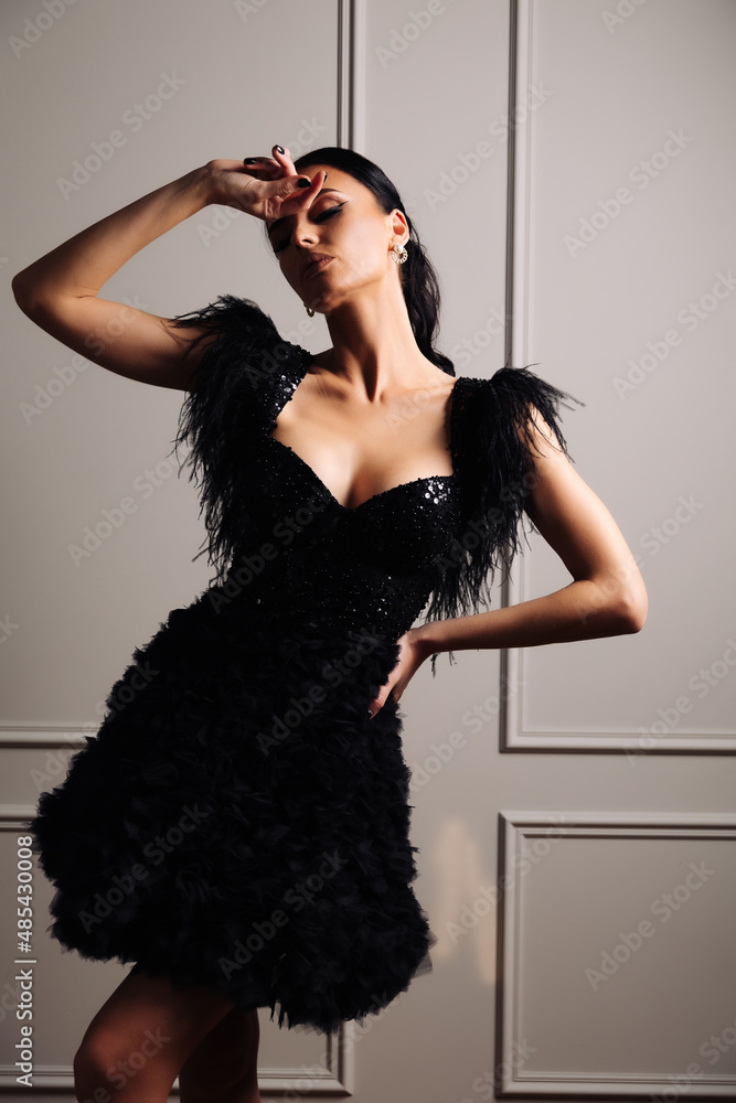 Graceful, tanned, elegant young woman in black evening dress posing in vintage interior. Fashion shot. Luxury lifestyle