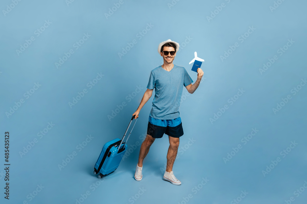 Full length caucasian joyful male traveler in a hat and sunglasses, dressed in summer wear, holds a blue suitcase, passport, ticket and small airplane, looks at camera, smile, isolated blue background