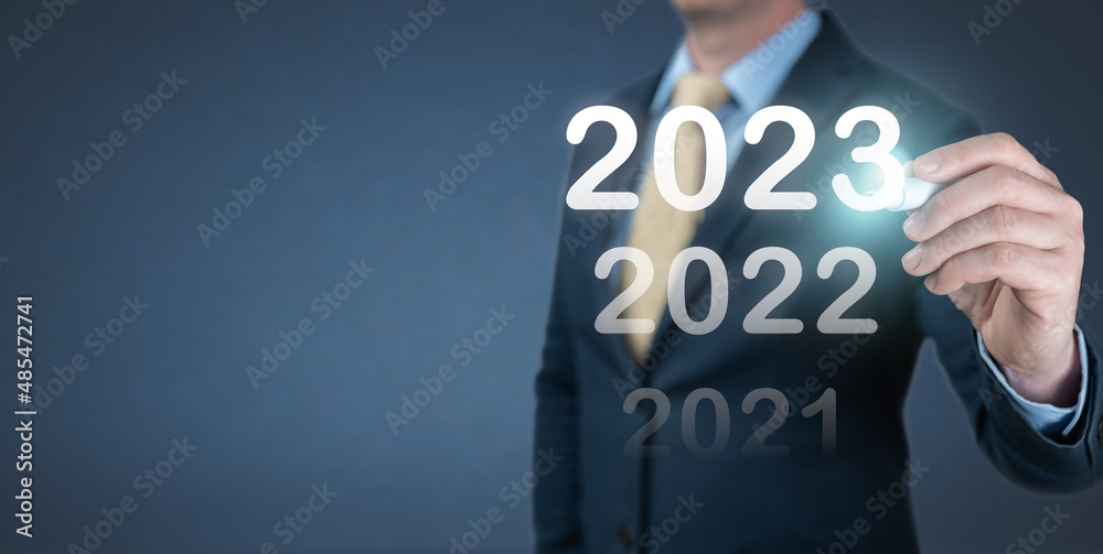 Hand businessman writing 2023 number on virtual screen. Business and Technology target set goals and achievement in 2023 new year resolution, planning and start up strategies and ideas. banner