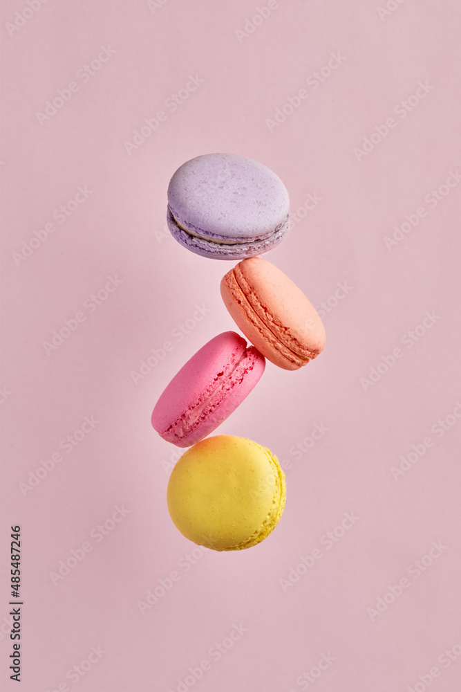 Colorful delicious French dessert macaron or macaroons flying or falling in motion on pink background
