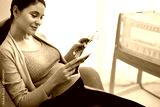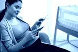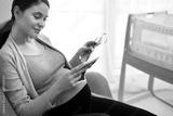 Caucasian woman in advanced pregnancy browsing ultrasound scan in baby's room