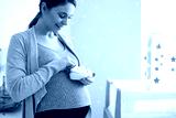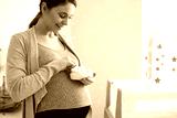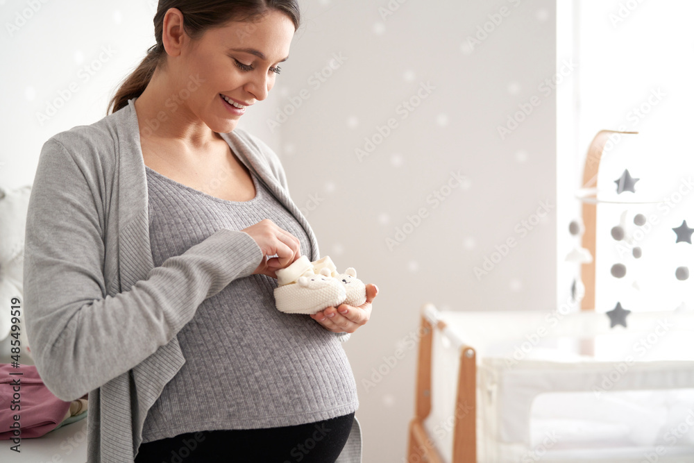 Caucasian woman holding baby's shoes and standing int baby's room