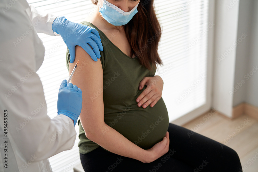 Pregnant caucasian woman sitting with protective mask after vaccination