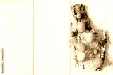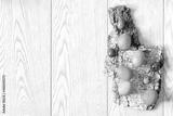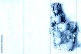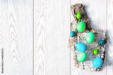 Blue and green painted easter eggs on tree bark on wooden background with copy space, spring, easter concept