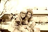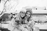Portrait of two cheerful women friends heaving fun standing outdoor near van, enjoying winter time.