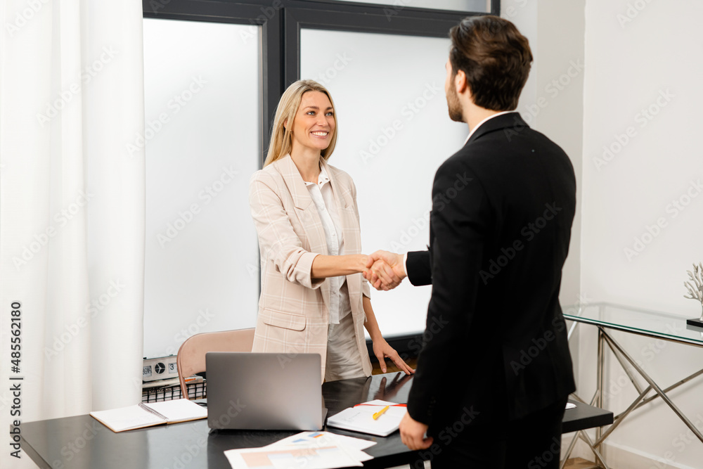 Big deal. Pleasant young confident businessman and businesswoman wearing formal clothes are standing opposite and shaking hands. Stock photo