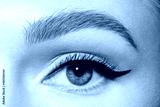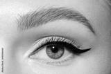 Female blue eye with trendy perfect fashion makeup, eyeliner on eyelid, ideal shaped eyebrow, mascara on eyelashes. Close-up caucasian woman with make up on eyes, skincare cosmetics advertisement.