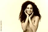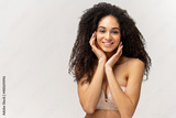 Gorgeous sophisticated woman stands over white background. She touching her face gently and looking at the camera. Beautiful multiracial brunette lady. Self-love and body care concept