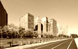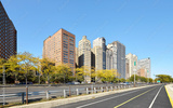 Buildings along the Lake Michigan waterfront on a sunny summer day, Chicago, USA.