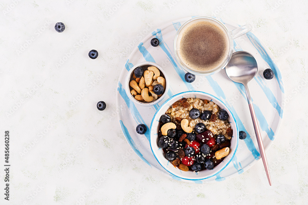 Bowl of oatmeal porridge with berries and nuts. Top view. Clean eating