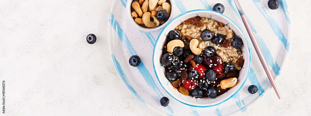 Bowl of oatmeal porridge with berries and nuts. Top view. Banner