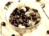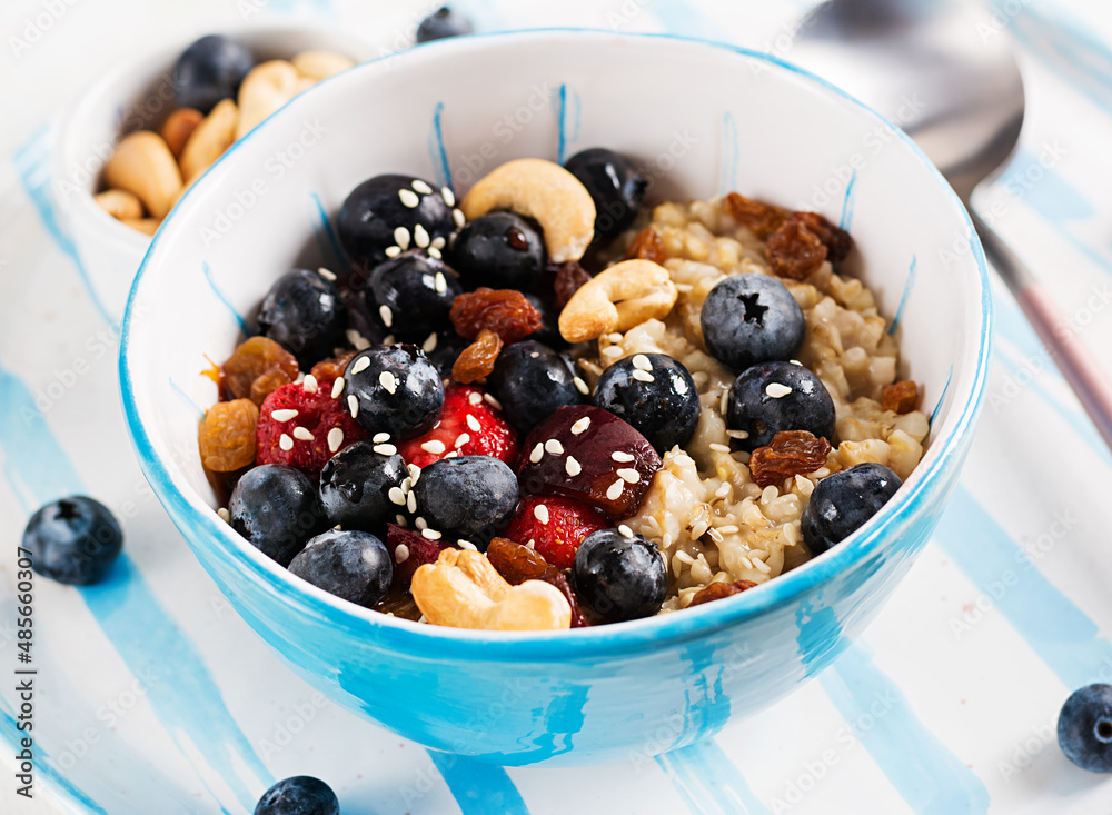 Bowl of oatmeal porridge with berries and nuts. Clean eating