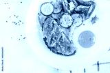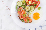 Diet breakfast. Fried eggs and sandwiches with salt salmon and cucumber, tomatoes, lettuce. Top view, overhead