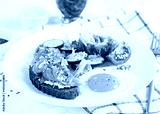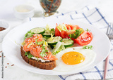 Diet breakfast. Fried eggs and sandwiches with salt salmon and cucumber, tomatoes, lettuce.
