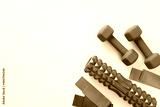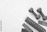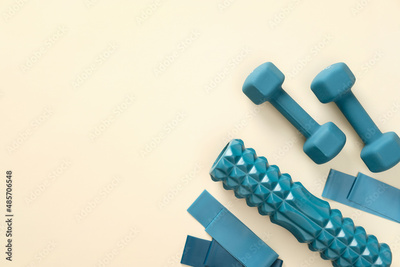 Workout equipment for training at home top view. Flat lay blue dumbbells, elastic bands, exercise roller on beige background