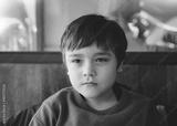 Cinematic portraitPortrait Kid looking deep in thought,Dramatic Young boy sitting alone in coffee shop or cafe waiting for food, A Child looking out with thinking face.