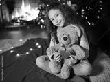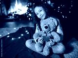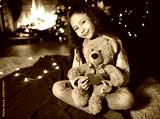 the child is a cute girl with curly hair smiling sitting on a red plaid and holding a teddy bear and a red heart against the background of the fireplace.