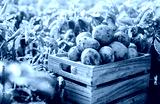 Fresh potatoes in a wooden box in a field. Harvesting organic potatoes.