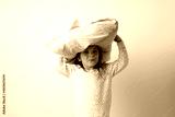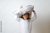 Portrait of pretty caucasian girl in white pyjama and pillow in studio white background