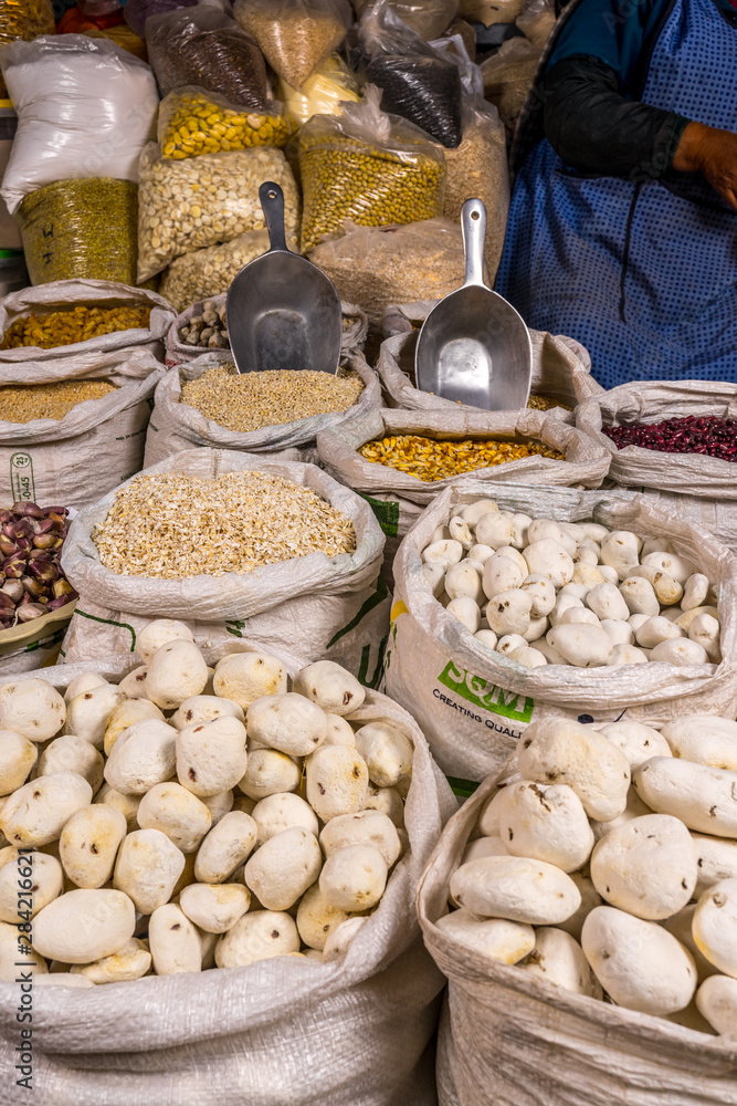 Set of Chinese dishes on white table: sweet and sour chicken, fried spring rolls, noodles, rice, steamed buns with bbq glazed pork, Asian style banquet or buffet, top view copy space