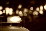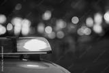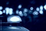 Blue flasher light of siren of police car at night city street. Themes crime, emergency and help.