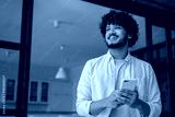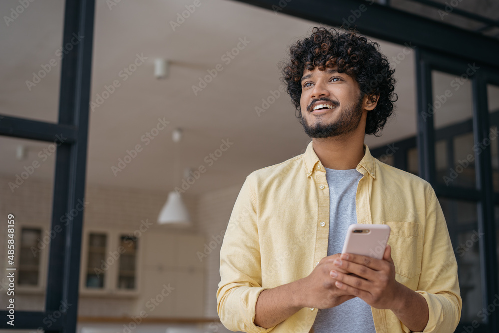 Handsome smiling Indian man holding mobile phone shopping online looking away at home, copy space