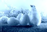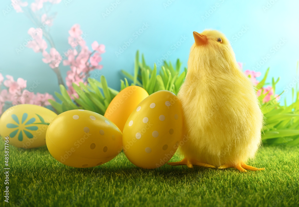 Easter eggs and chicken on green grass on blue background.