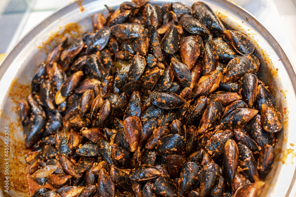 Bowl of Midye dolma stuffed mussels, a traditional turkish street food for sale in Istanbul, Turkey