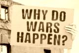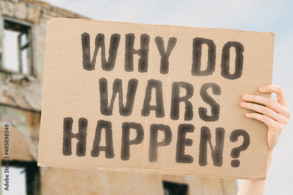 The question " Why do wars happen? " on a banner in men's hand with blurred background. Money. Impact. Tension. Risk. Stress. Hazard. Issue. Crisis. Right. Politic. Stop. Cost. Quiet. Soldier. Legal
