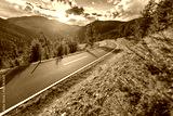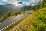 Motorbiker riding in Austrian Alps in beautiful sunset dramatic sky. Travel and freedom, outdoor activities