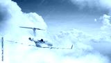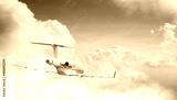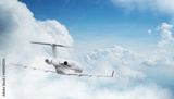 Private jet plane flying above clouds in beautiful sunset. Shot from back view