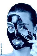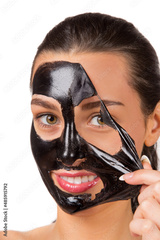 Beauty portrait of brunette woman. Skin care, black mask.