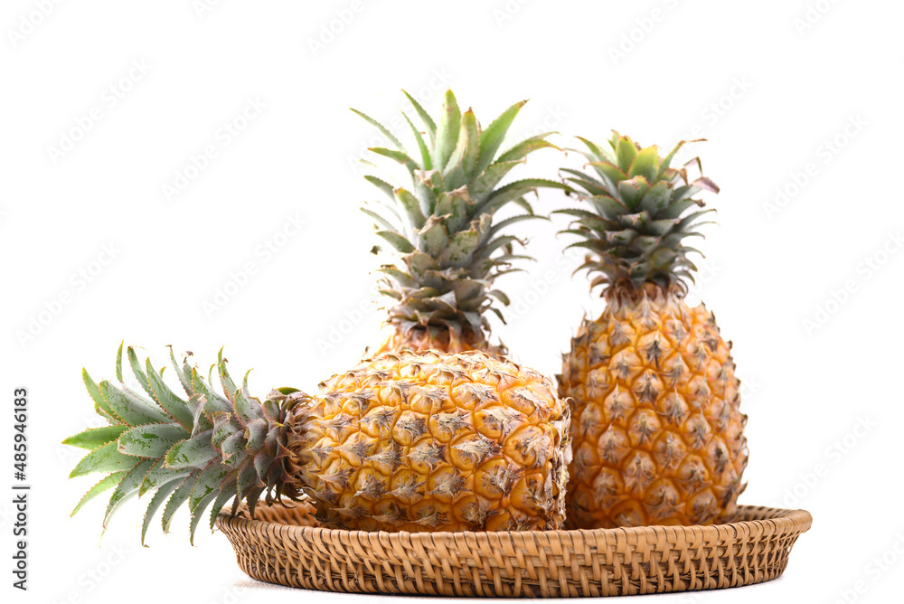 Fresh pineapple fruit in basket on white background, Tropical fruit