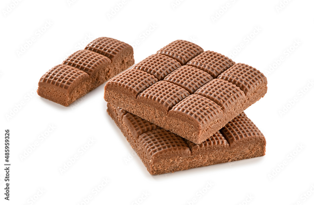 chocolate toffee bar pieces with checkered texture close-up isolated on white background