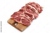 Raw pork sliced meat on wooden board on white background. Heap of pieces raw pork isolated on white background. Butchery, market, shop