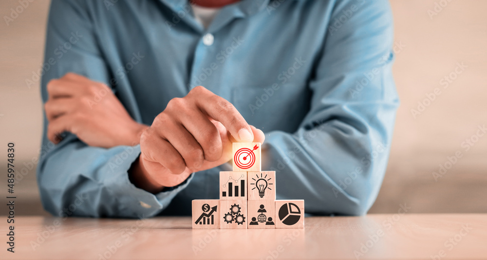 hand stack woods block step on table with icon Action plan, Goal and target, success and business target concept, project management, company