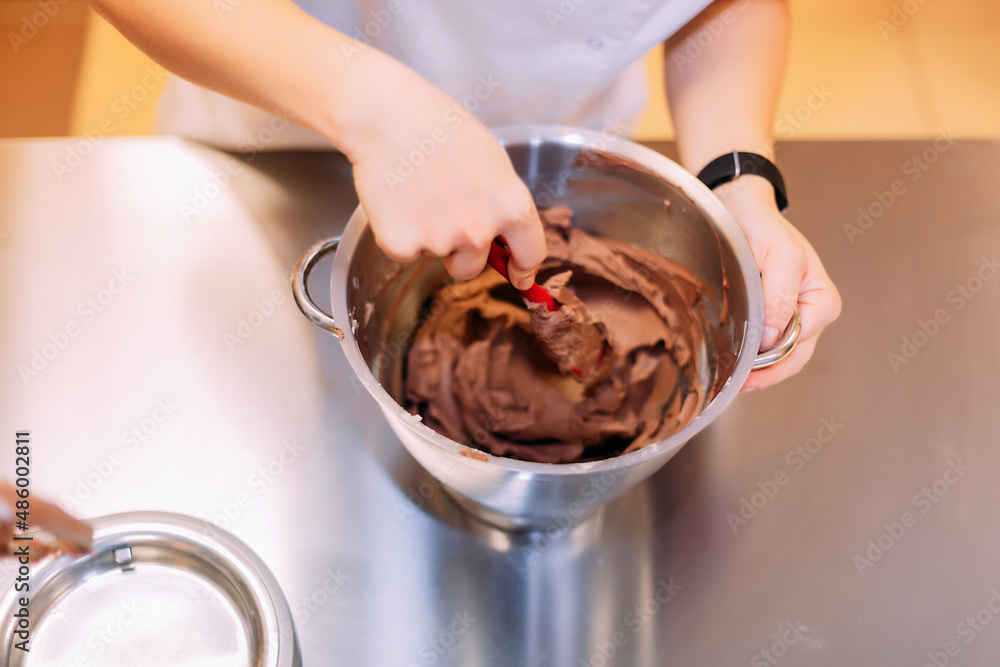 Pastry chef girl stirs chocolate cream in a metal bowl